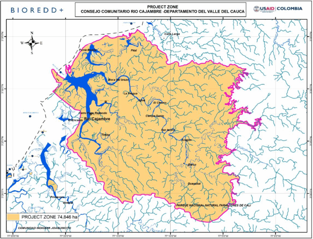 The Cajambre REDD+ Project is located in Colombia’s Valle del Cauca department, within the municipality of Buenaventura on the Pacific coast. It lies near the Farallones de Cali National Park and forms part of the Chocó Biogeographic Region—one of the most biodiverse ecosystems globally. The landscape is predominantly lowland tropical rainforest with dense river networks, high rainfall, and rich biodiversity. The project area is accessible from Buenaventura, the nearest major city and port. The territory is collectively owned by Afro-Colombian communities and managed under community governance structures recognized by national law.